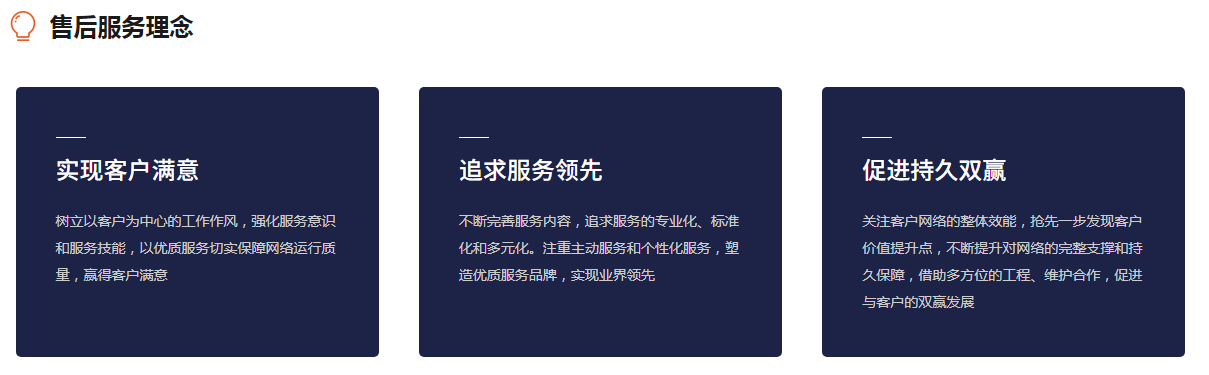 为确保技术支持和售后服务的质量,完全满足客户对技术和服务的需求,我公司建立了以总部热线服务部为中心、区域技术支持团队为主体的二级完善服务体系。各省技术支援部准确快捷地为客户提供技术支持与售后服务。