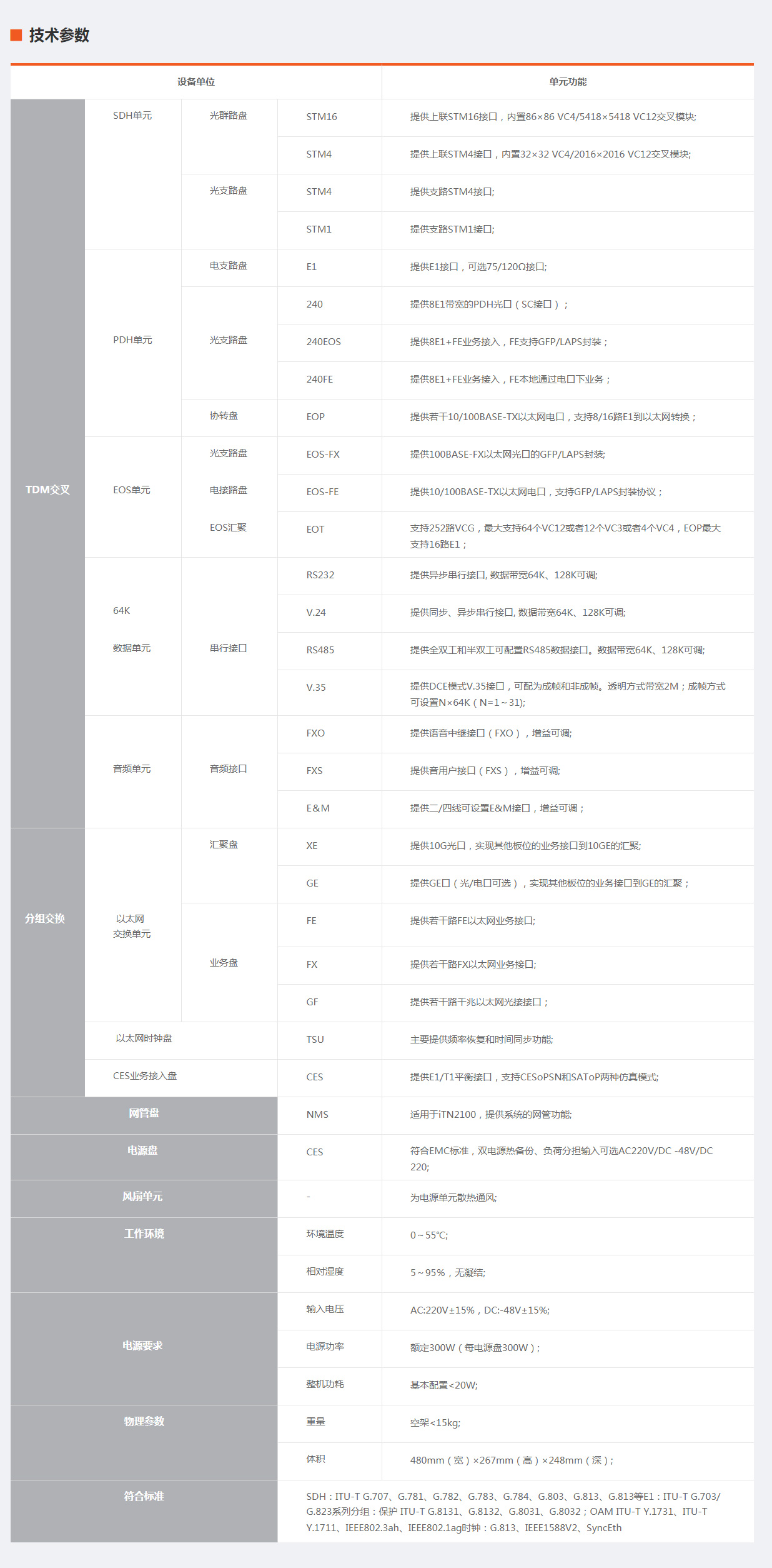 iTN2100光电一体化产品定位于电力通信网络的业务接入,线路侧可提供SDH 155M/622M/2.5G上行,满足和SDH设备的无缝对接,业务侧可以提供GE、FE、SDH、PDH、FXO、FXS、RS232、E&M等接口。