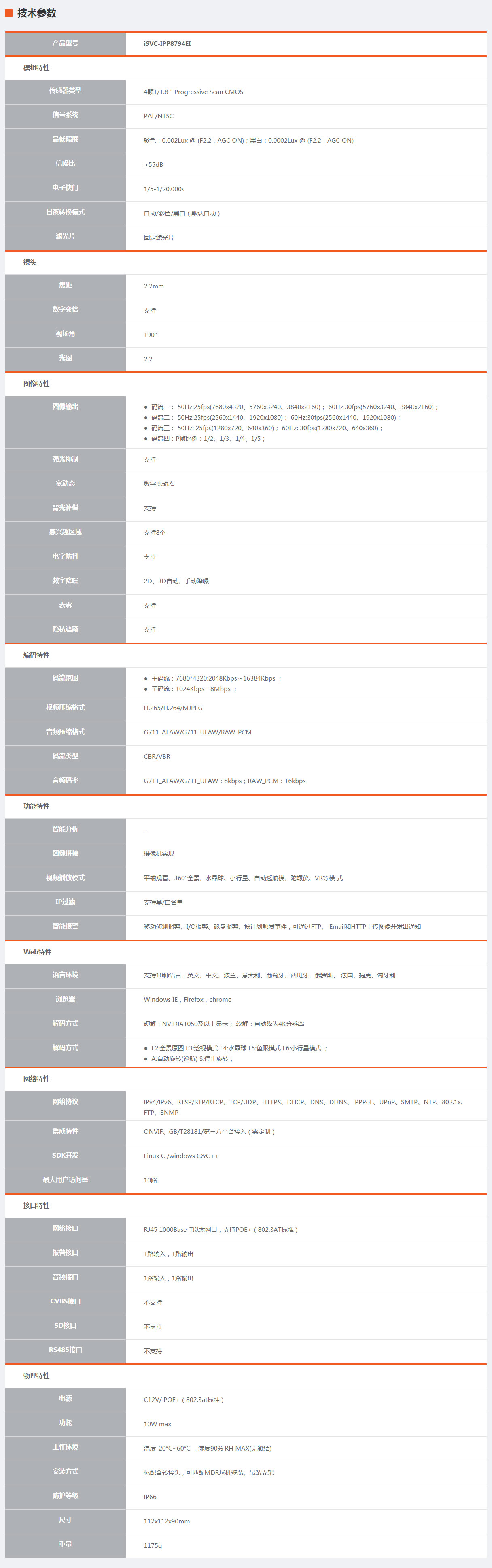 iSVC-IPP8794EI四目全景网络摄像机支持四颗1/1.8" CMOS ,H.265/H.264,12MP@20fps,32MP@25fps,定焦 2.2mm,前端图像拼接,四目单IP输出,360°全景、水晶球、小行星、 鱼眼等图像播放模式,DC12V/POE+,1路音频输入输出,内置拾音器、1路报警输入输出,数字宽动态,11项智能分析。广泛应用于需要大范围高清画质监控的场所,如: 街道、广场、机场、公园、景区、车站、 大型场馆等场所 。