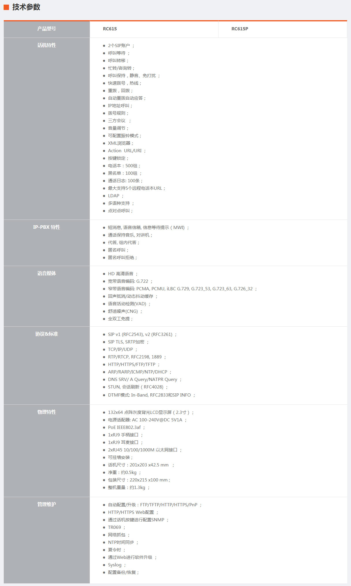RC61S/RC61SP是一款入门级的多功能高清IP语音话机,简单易用、性价比极高,适用于各种环境。 具有卓越的高清语音品质以及丰富的电话系统功能,充分满足中小企业、呼叫中心以及行业用户的 需求。 RC61S/RC61SP SIP话机采用话机采用132x64分辨率背光液晶屏,具备安装方便、配置简单、易用等特点。支 持2个SIP账户,支持3方会议功能,通过与IPPBX完美配合,实现丰富的业务功能。