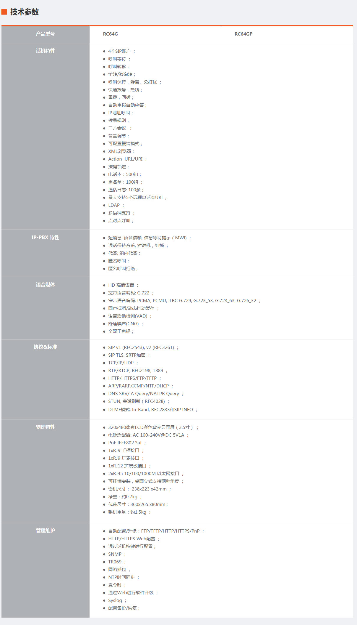 RC64G/RC64GP是一款专为商务人士设计的的多功能高清IP语音话机,外观大气,性能极佳,适用于各种 环境;它采用3.5寸背光彩色液晶显示屏, 最大分辨率为320x480, 具有很好的视觉效果,并具有卓越的高清 语音品质以及丰富的电话系统功能,充分满足不同用户的需求。 RC64G/RC64GP SIP话机采用双千兆以太网口,具备安装方便、配置简单、易用等特点。支持4个SIP账户, 支持3方会议功能,通过与IPPBX完美配合,实现丰富的业务功能。